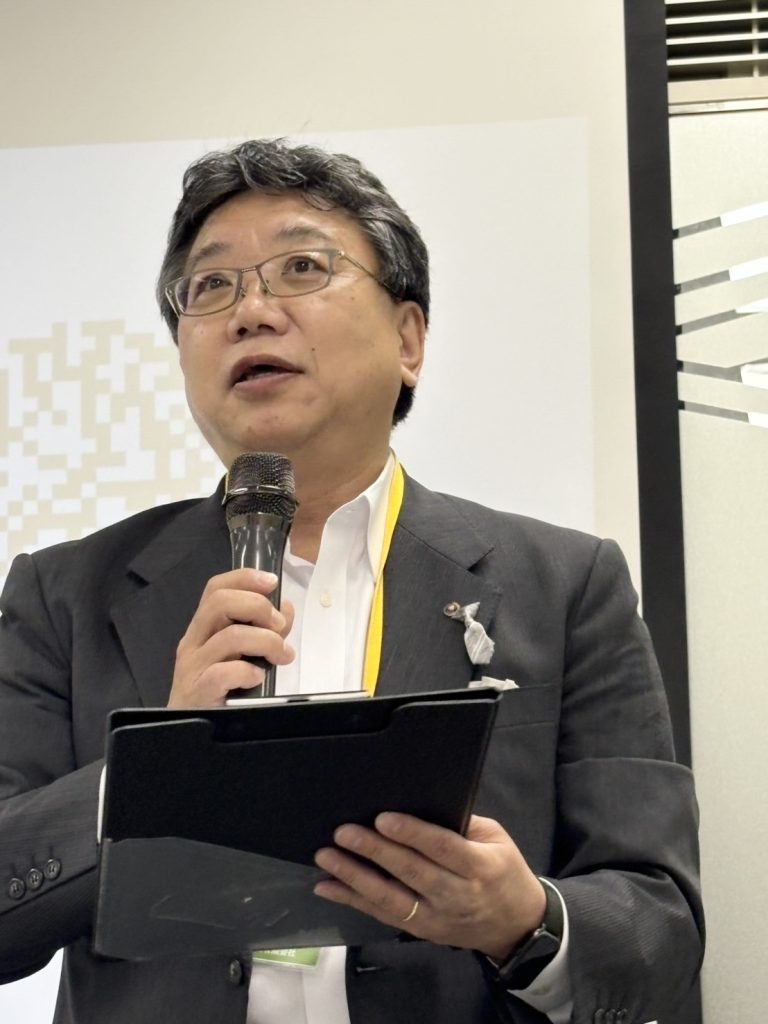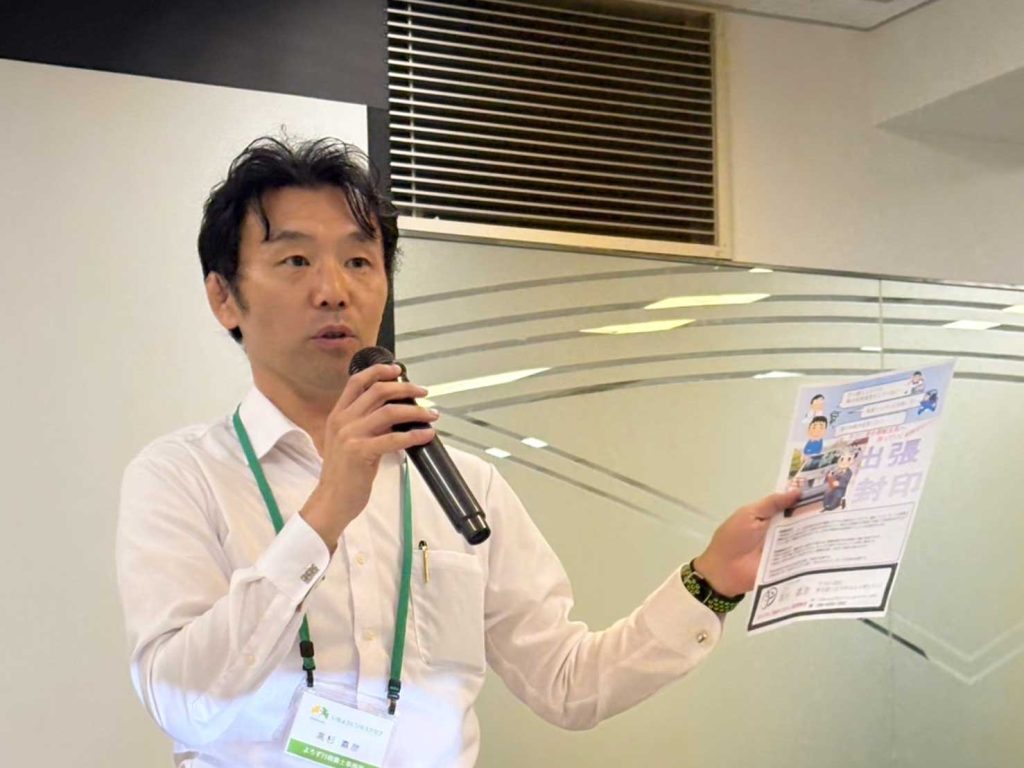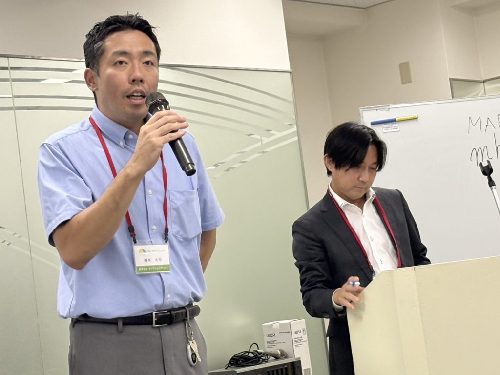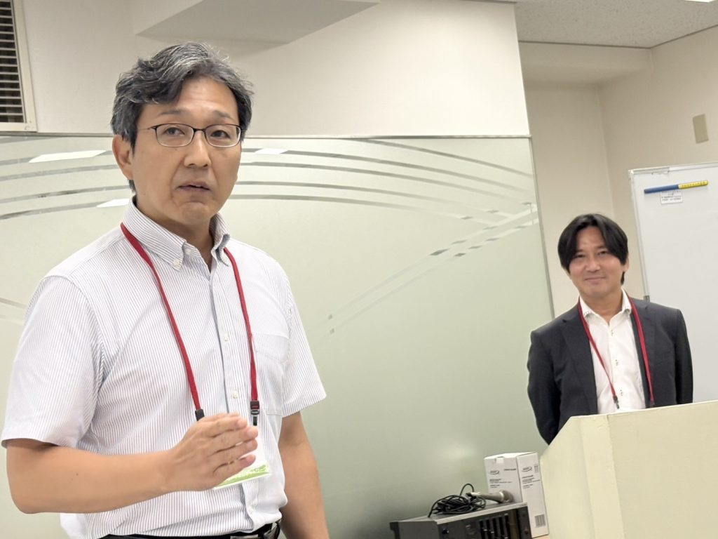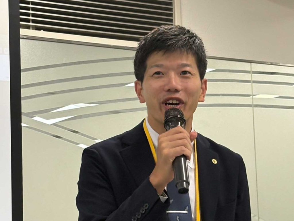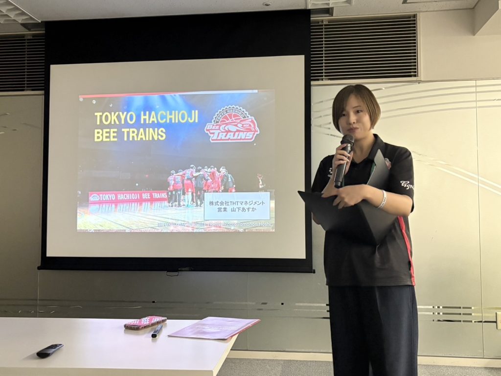 営業の山下様から、エスフォルタアリーナを本拠地とするプロバスケットチーム 東京八王子ビートレインズの活動状況、理念などの紹介