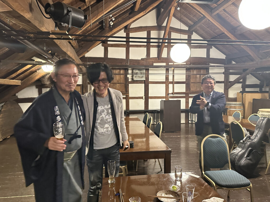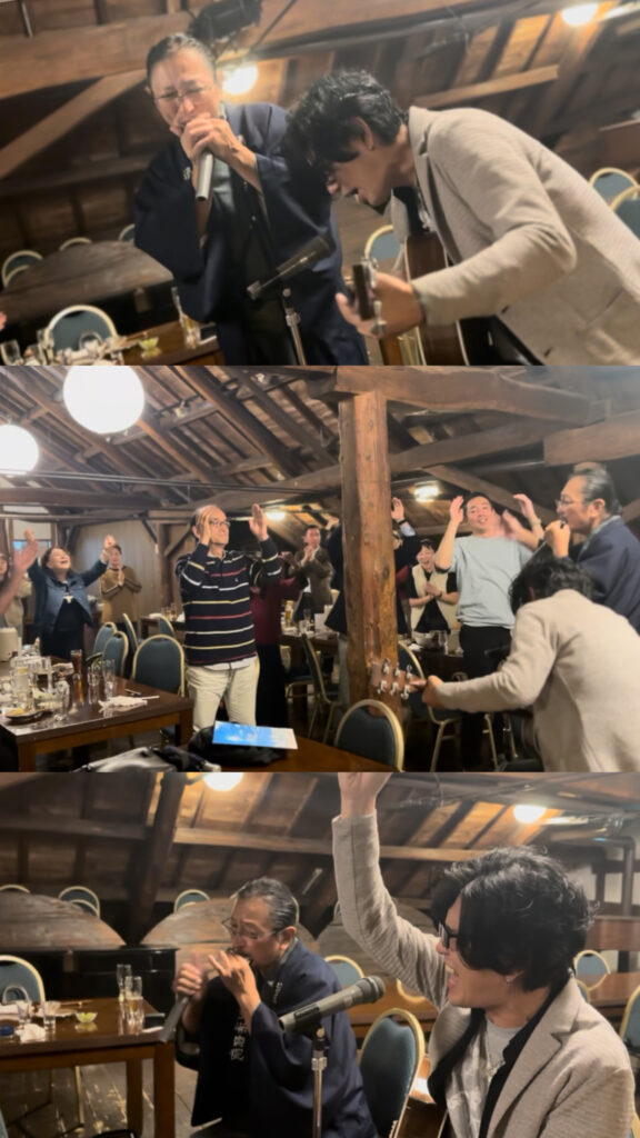見学後の懇親会では、会員のミュージシャンによるギター弾き語りのオリジナルソングに、石川彌八郎社長のハーモニカ演奏が加わり、「石川酒造は多摩の自慢だ♪」というフレーズを参加者全員で歌うなど、会場は一体感と笑顔に包まれ、大いに盛り上がりました。